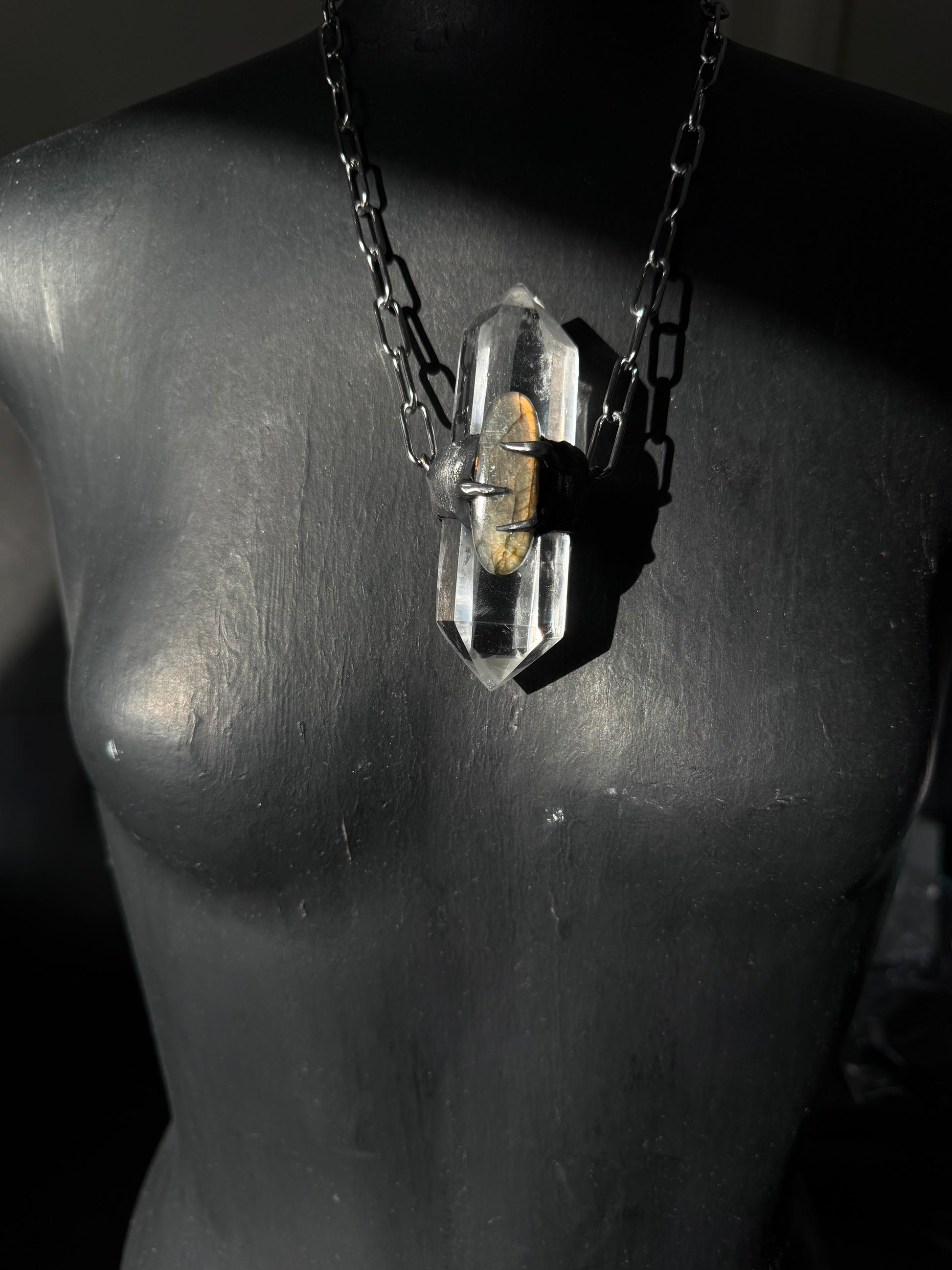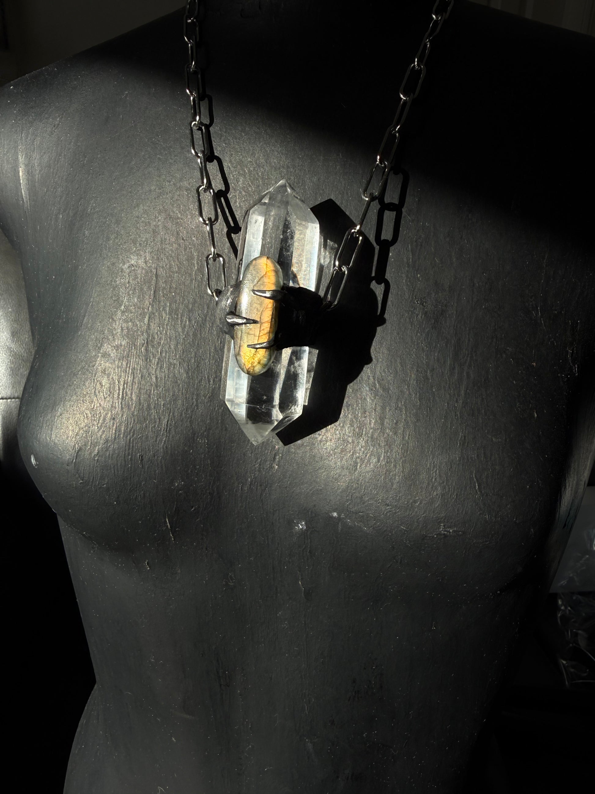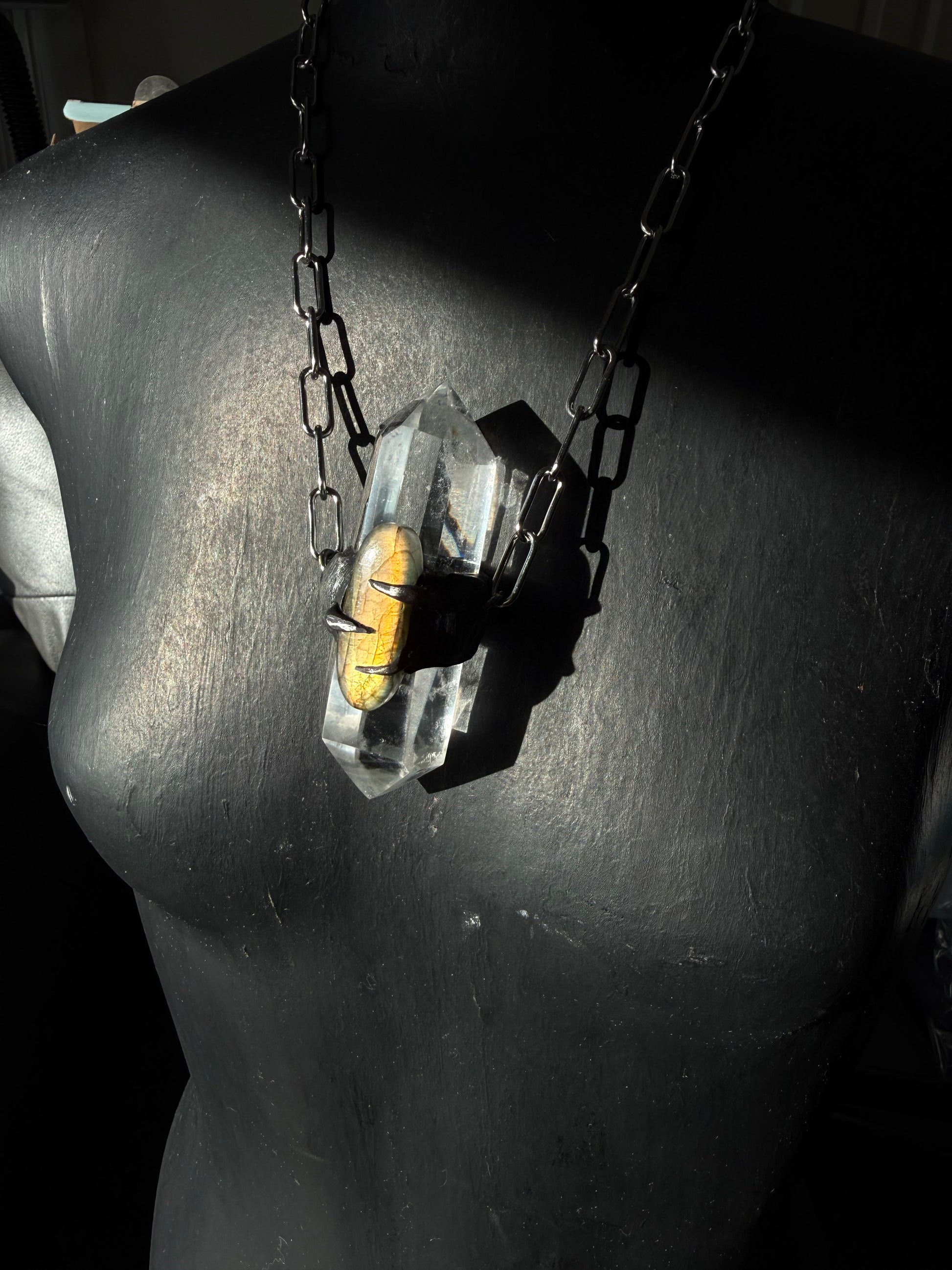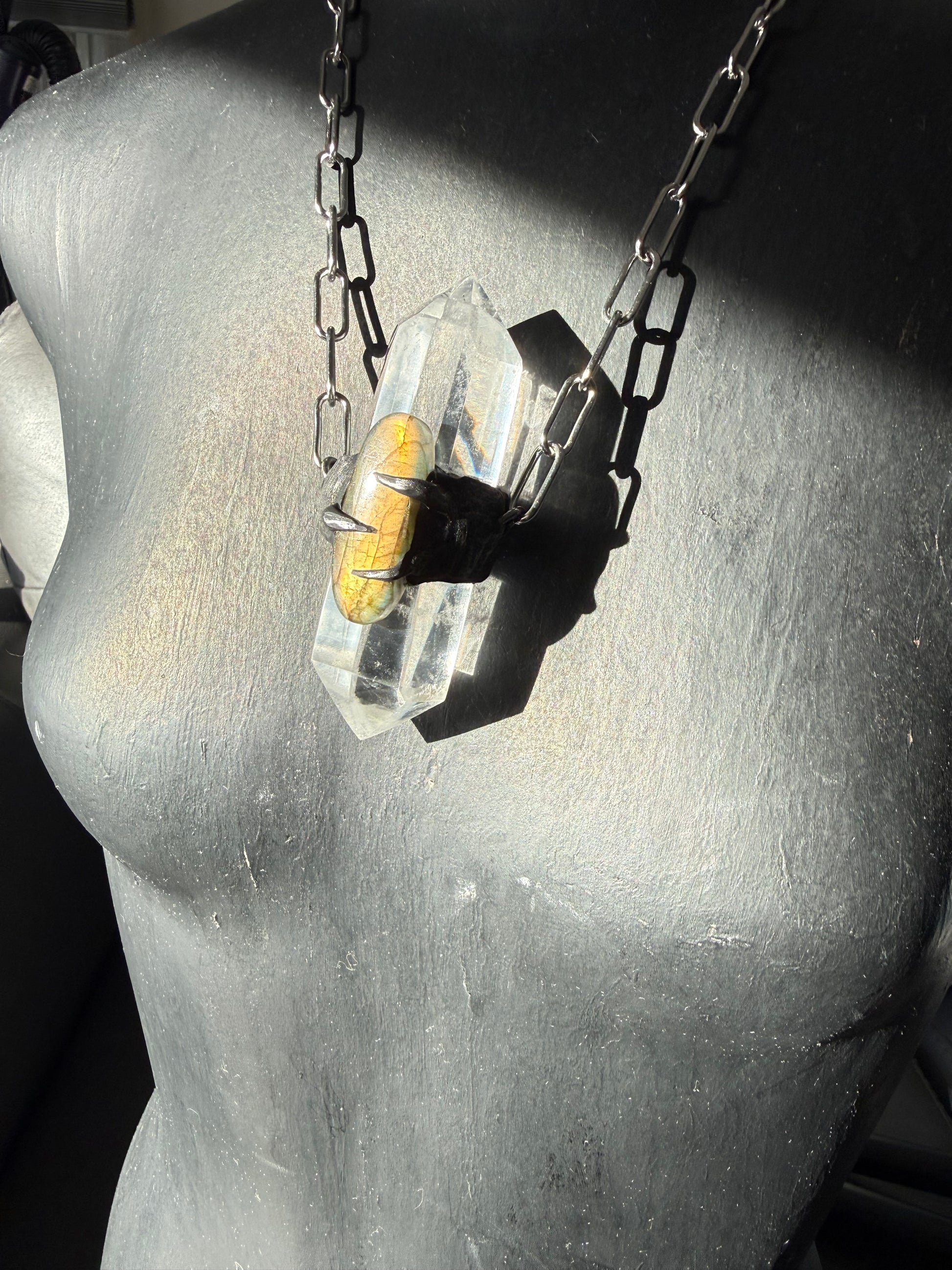 Clear Quartz DT with Golden Flash labradorite in hand sculpted setting strung on stainless steel chain approx 16 inches