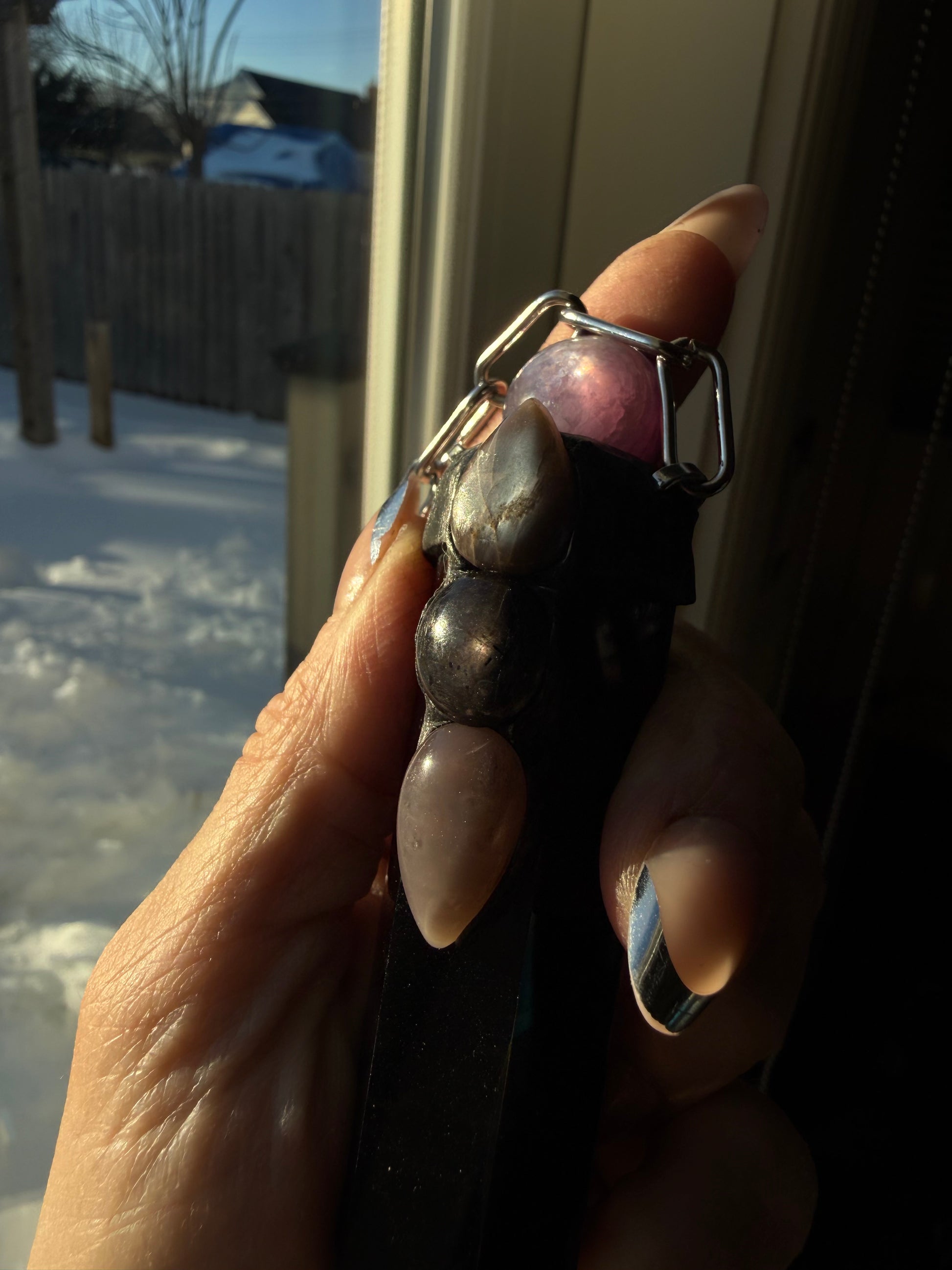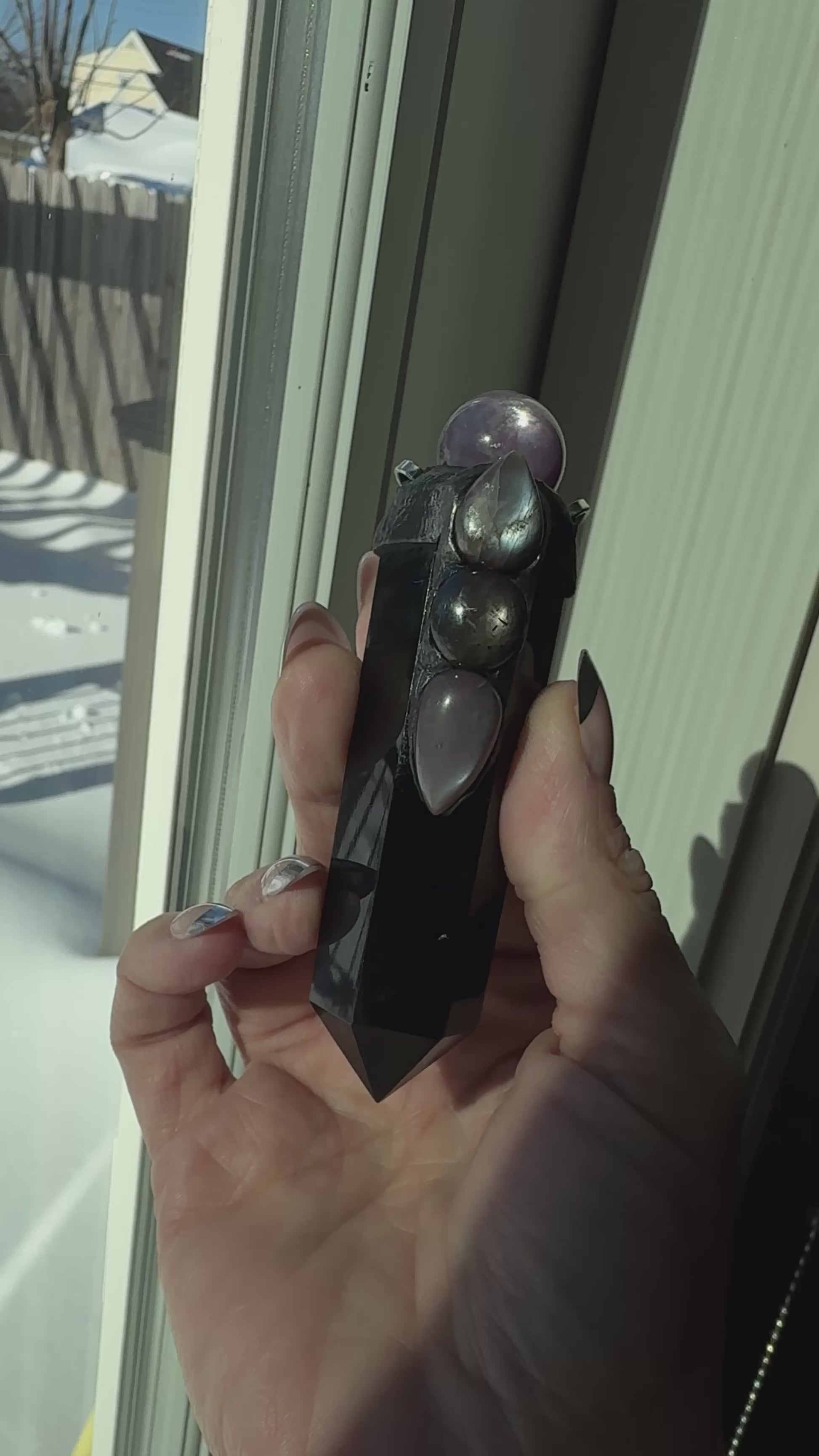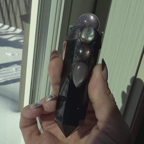 Black Obsidian Tower is adorned with a Ruby Black Moonstone and Lepidolite in a hand sculpted setting . Dark and powerful bringing the highest level of protection to the wearer while soothing the nervous system and healing the heart . Also brings creativity and helps w shadow work. Strung on stainless steel 18 inch long chain