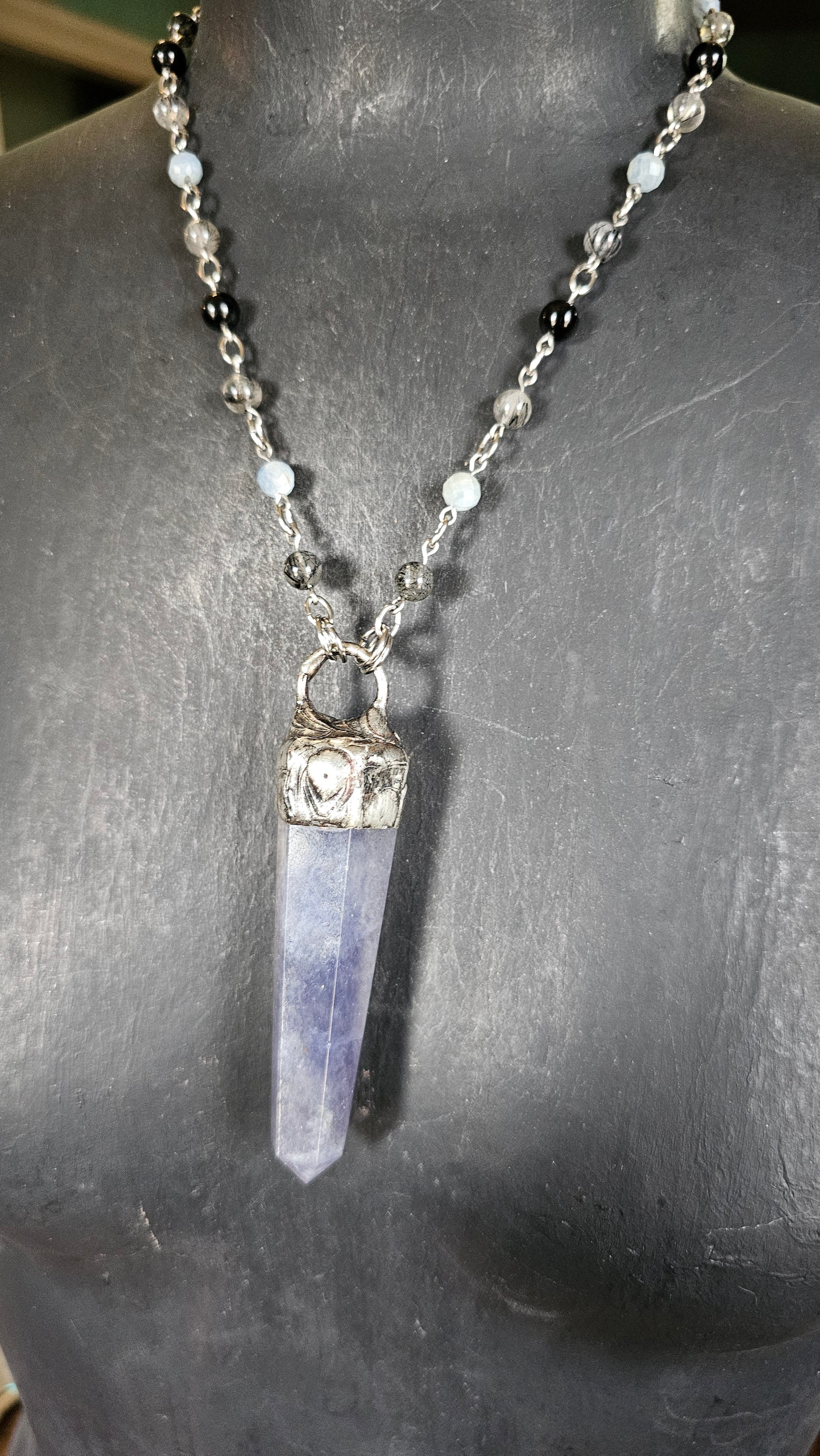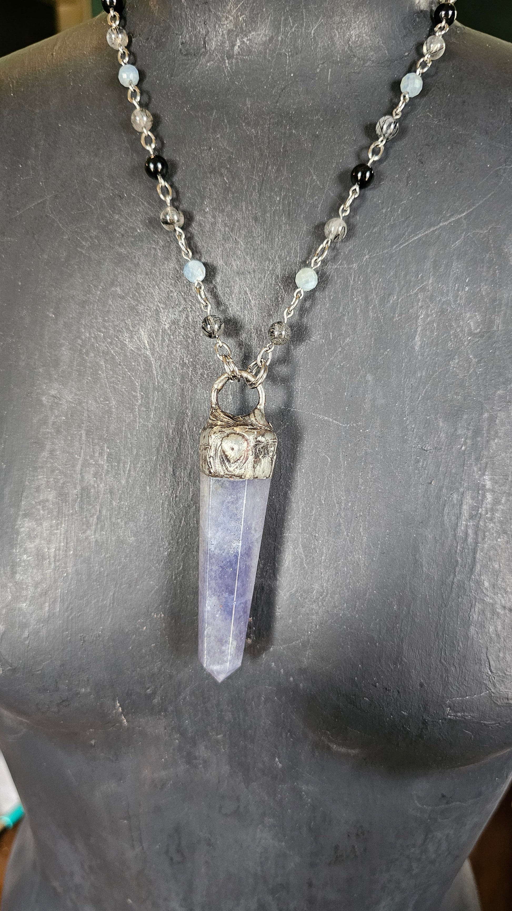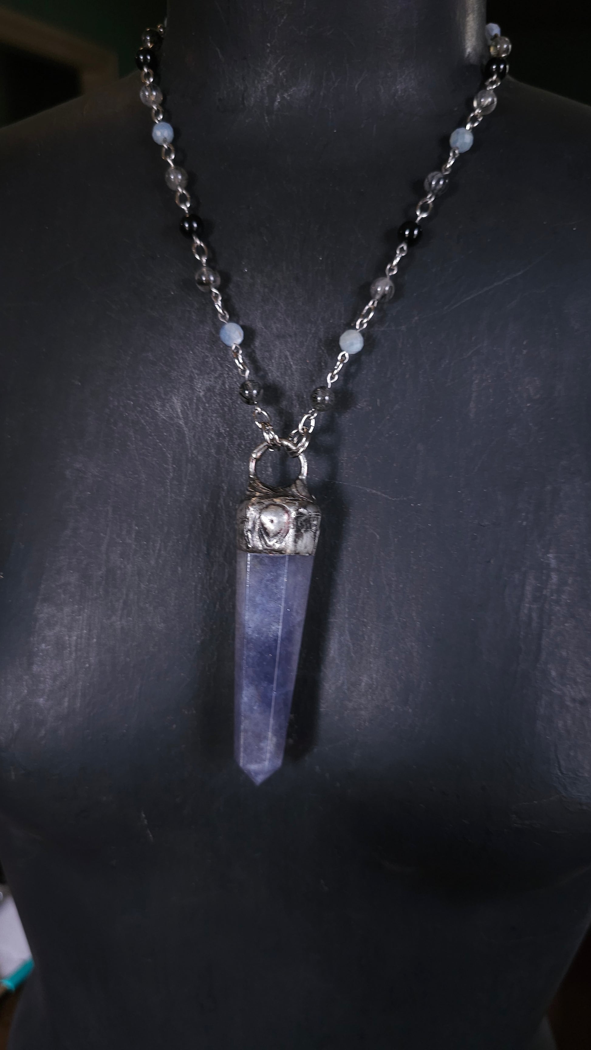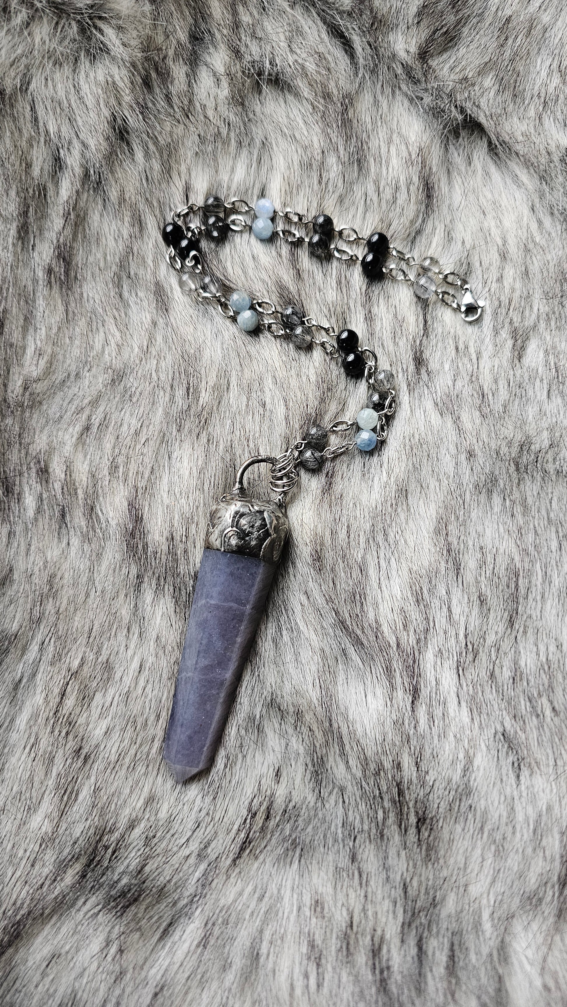 This Inner Seer Beaded Talisman features a striking Iolite tower on a beaded chain of Obsidian, faceted aquamarine, and rutile in Quartz. The stainless steel components make it a durable and stylish piece. Enhance your intuition and inner wisdom with this unique talisman.