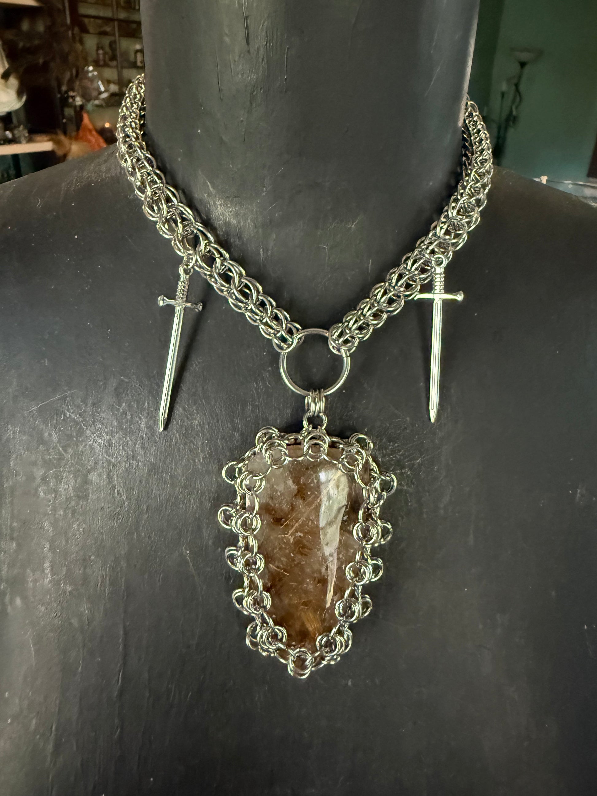 Embody strength and mysticism with this handcrafted chainmaille necklace, featuring a powerful rutilated quartz crystal encased in stainless-steel weaves and accented with two sword charms for a truly unique warrior aesthetic. This bold necklace fuses the ancient armor of chainmaille with the metaphysical energy of quartz, creating a statement piece that is both protective and empowering.