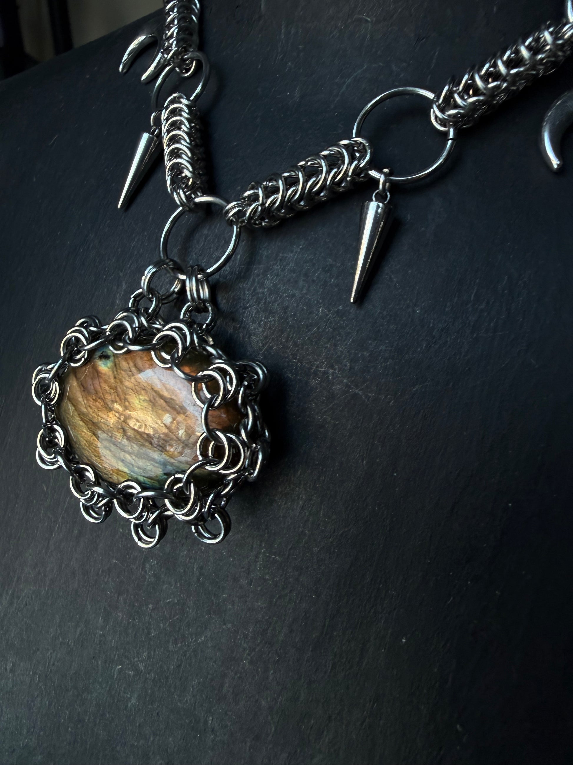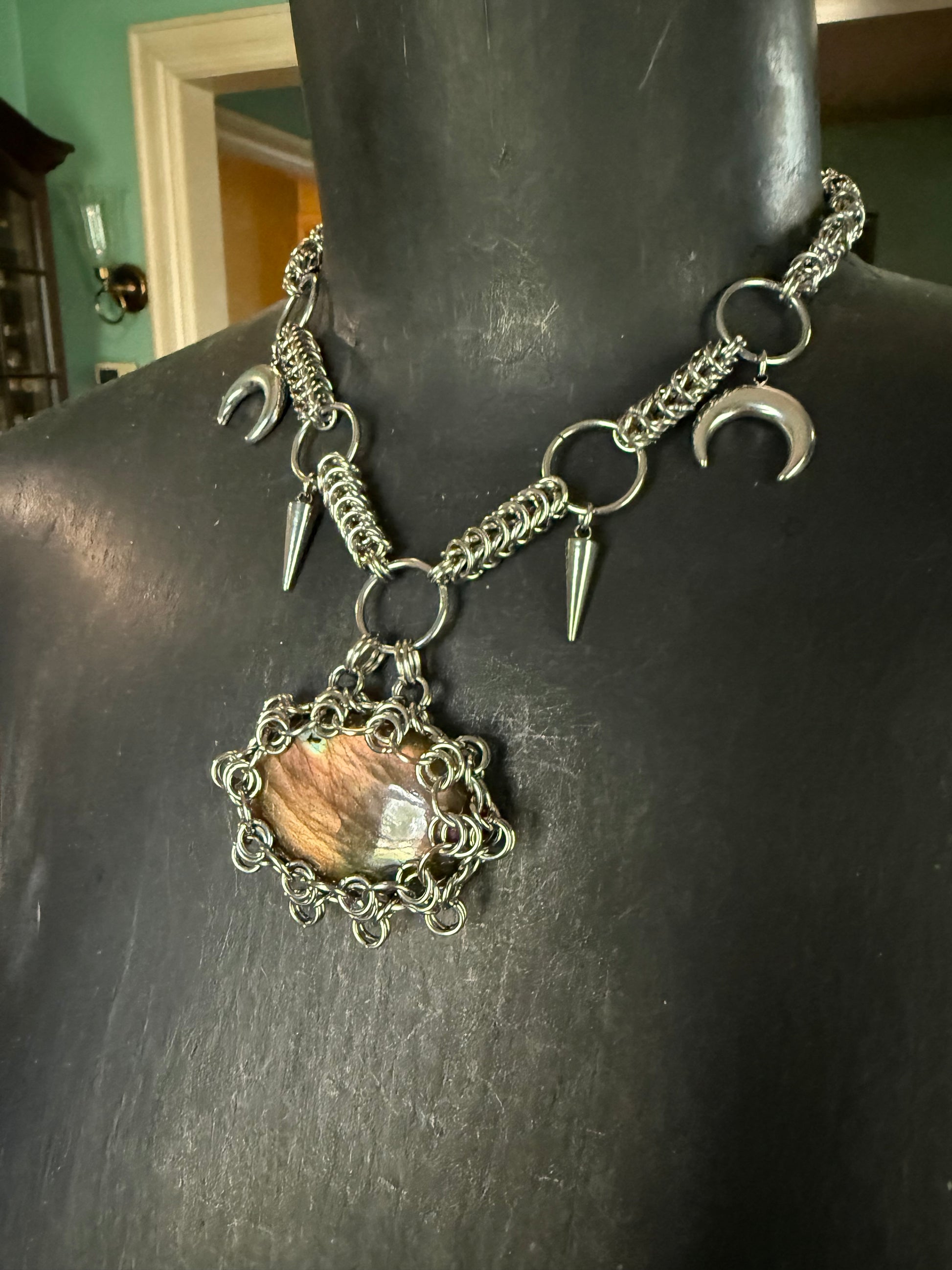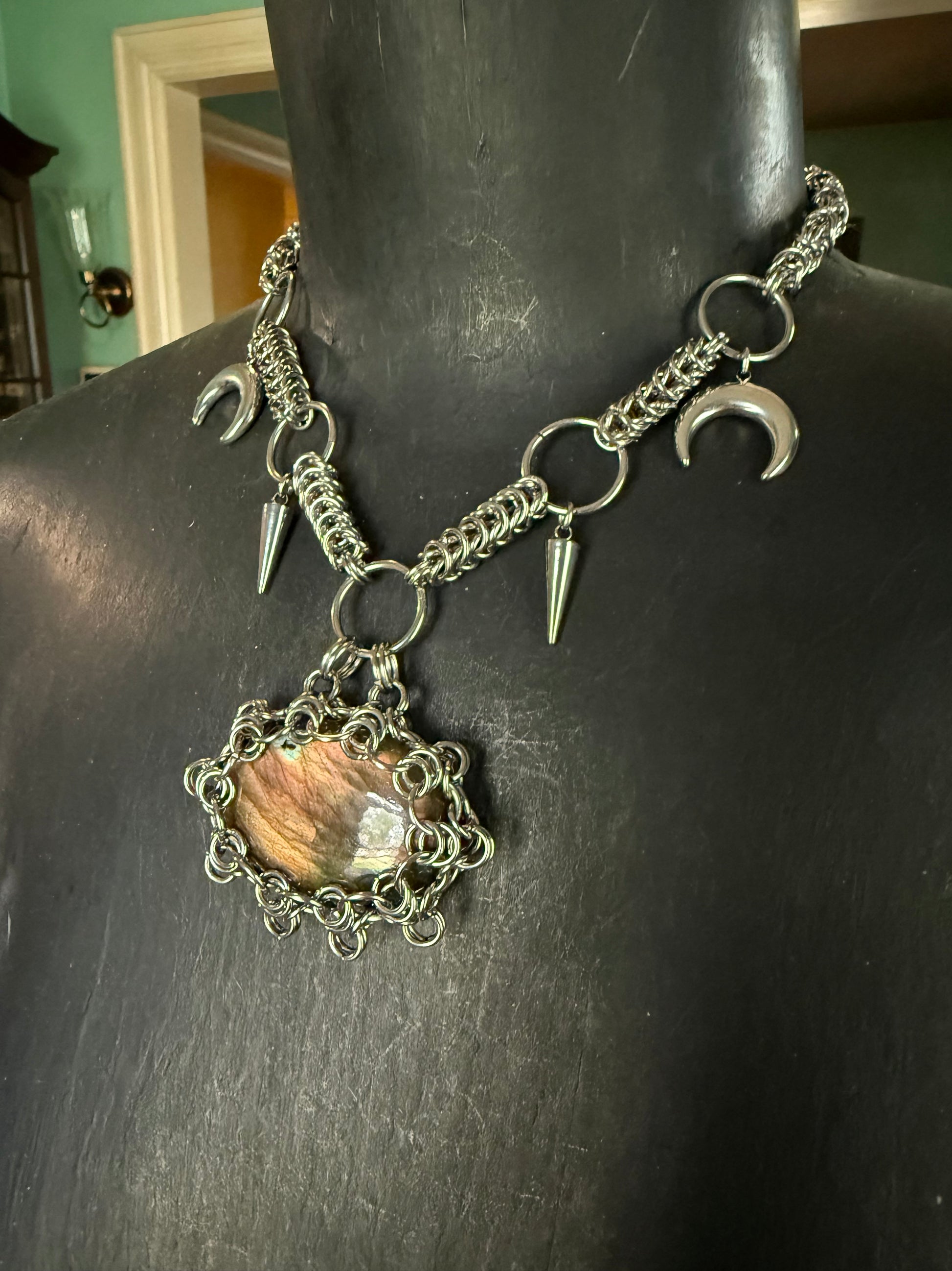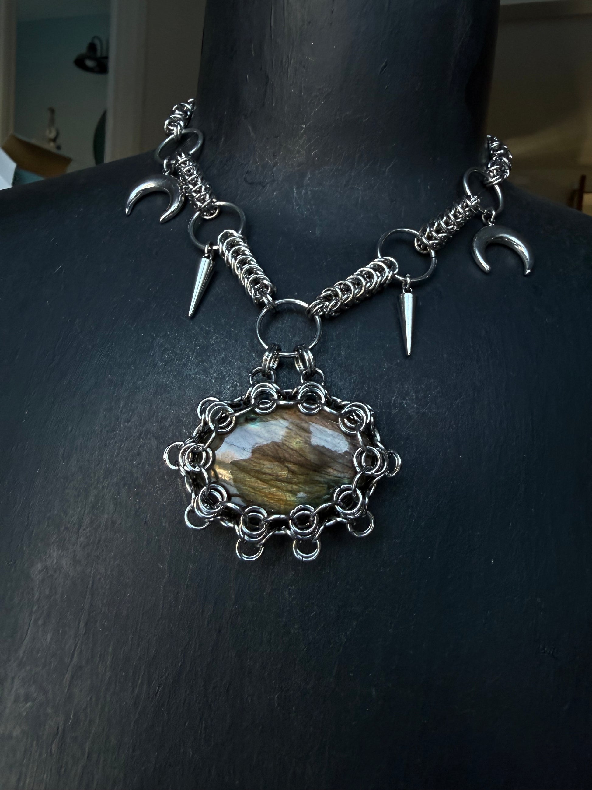 Labradorite moon necklace, chainmaille crystal jewelry, gothic moon phase necklace, witchy labradorite necklace, spiked statement necklace, stainless steel chainmaille jewelry, metaphysical protection necklace, lunar goddess amulet, festival witch jewelry, unique crystal pendant.