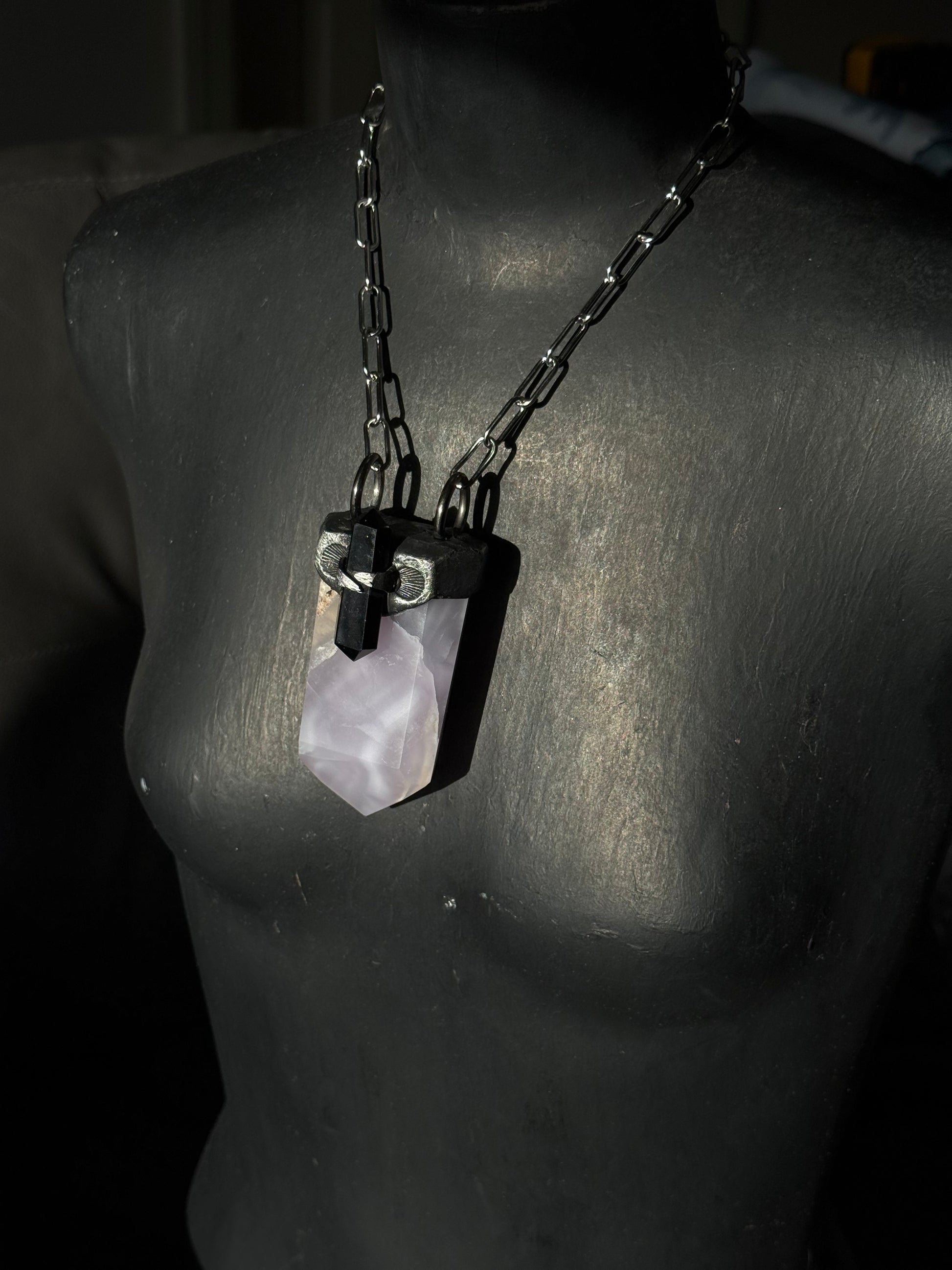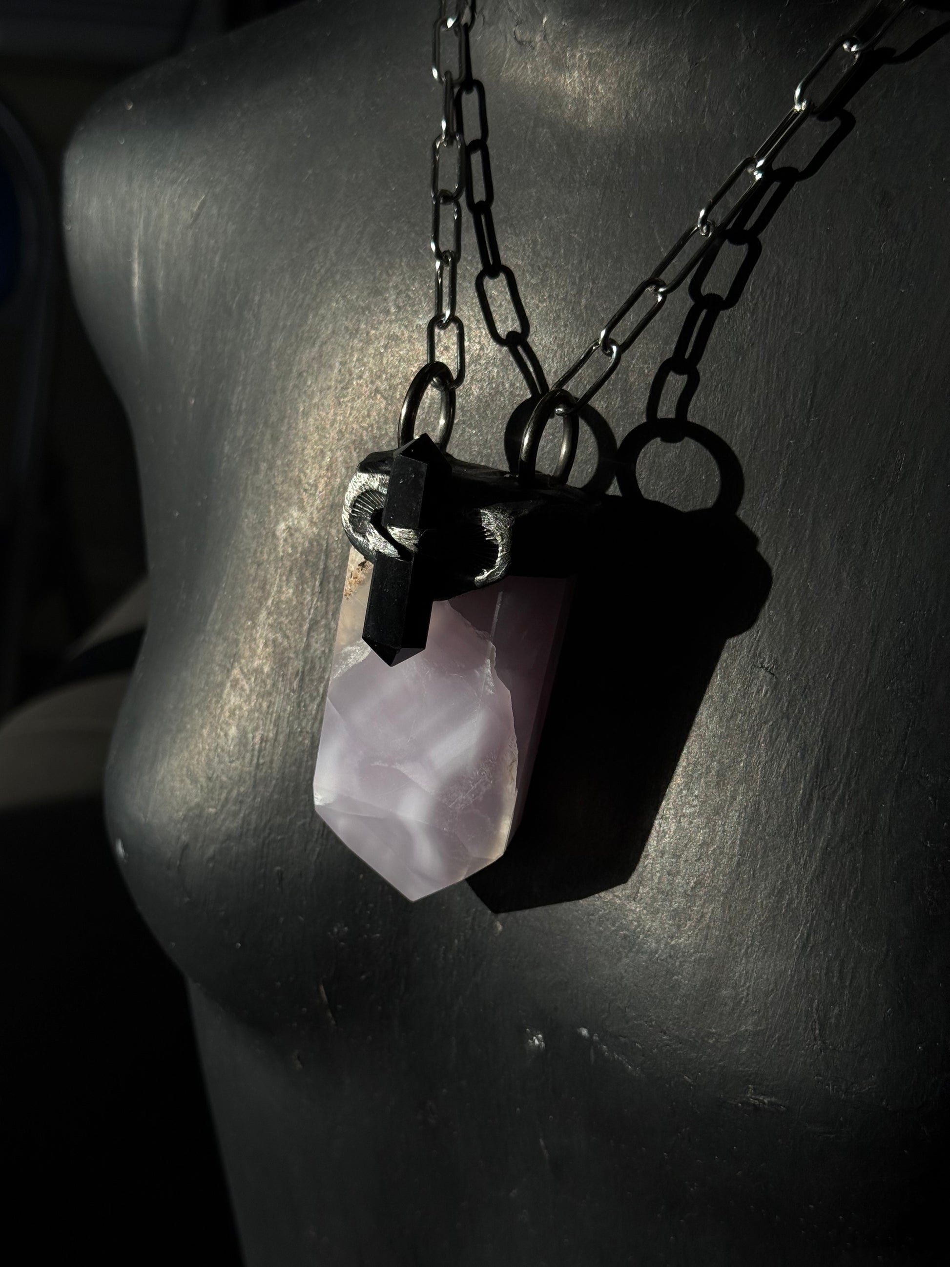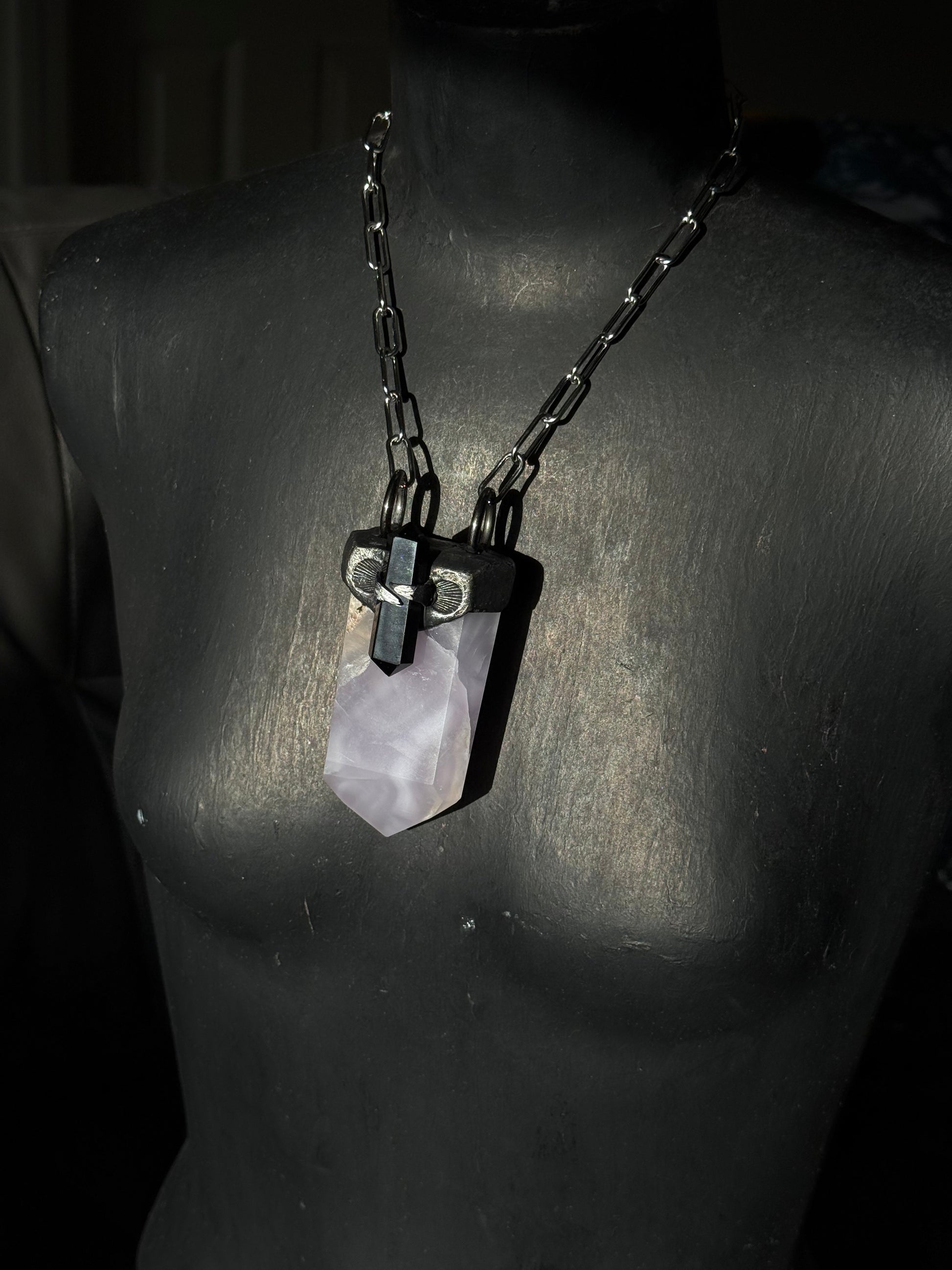The Return From the Ruins Talisman features Yttrium Flourite in a soothing lavender hue, complemented by a hand-sculpted setting featuring a mini obsidian double-terminated crystal. It is securely strung on an 18-inch stainless steel chain, providing durability. This combination promotes balance and clarity, suitable for everyday wear or spiritual practices and enhances intuition and allows flow of energy and connection w spirit guides .