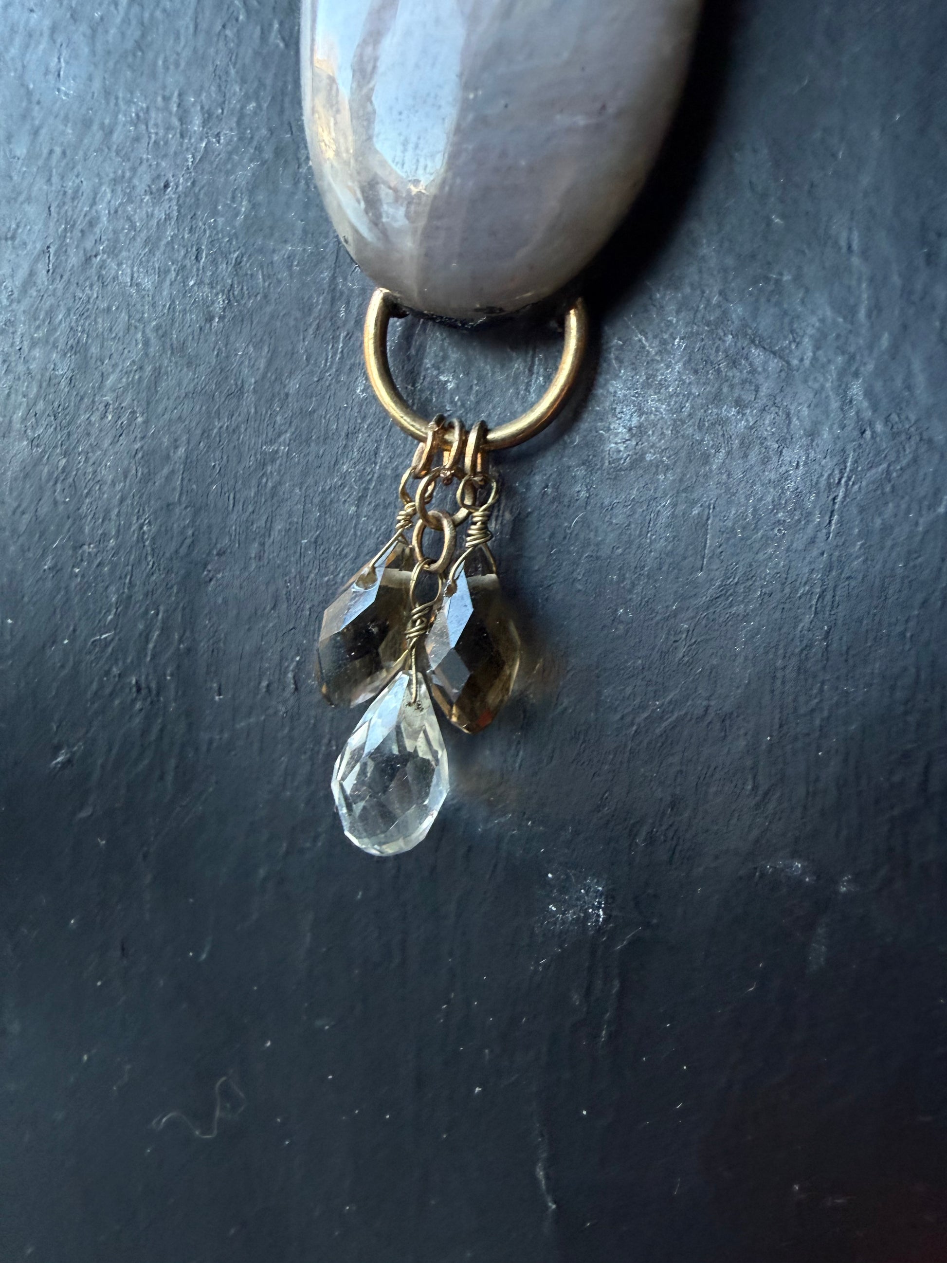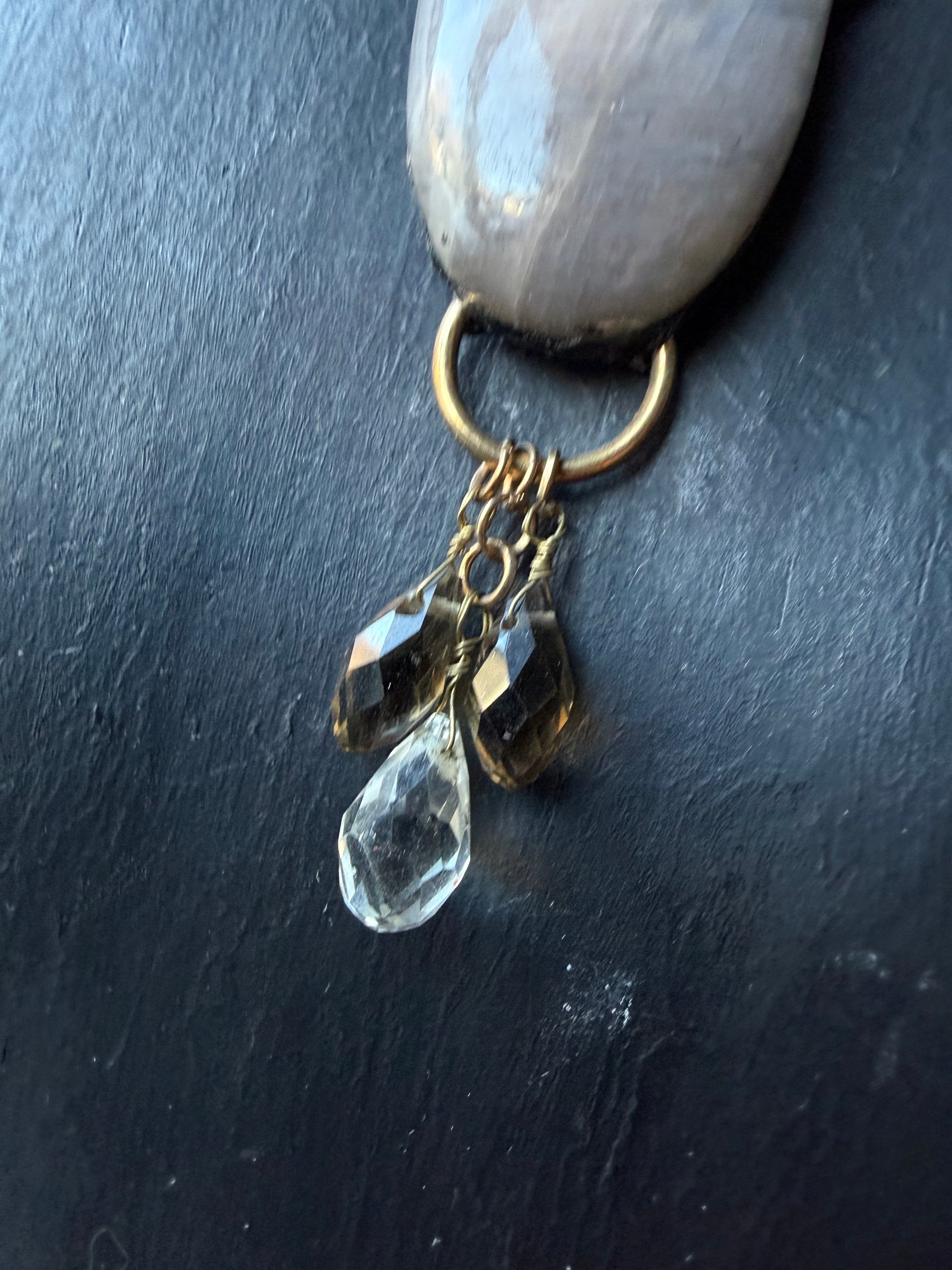 Belomorite Moonstone with full blue flags strung on vintage beaded chain with clear quartz and smoky Quartz dangling from the bottom . Strung on 16 inch beaded chain .