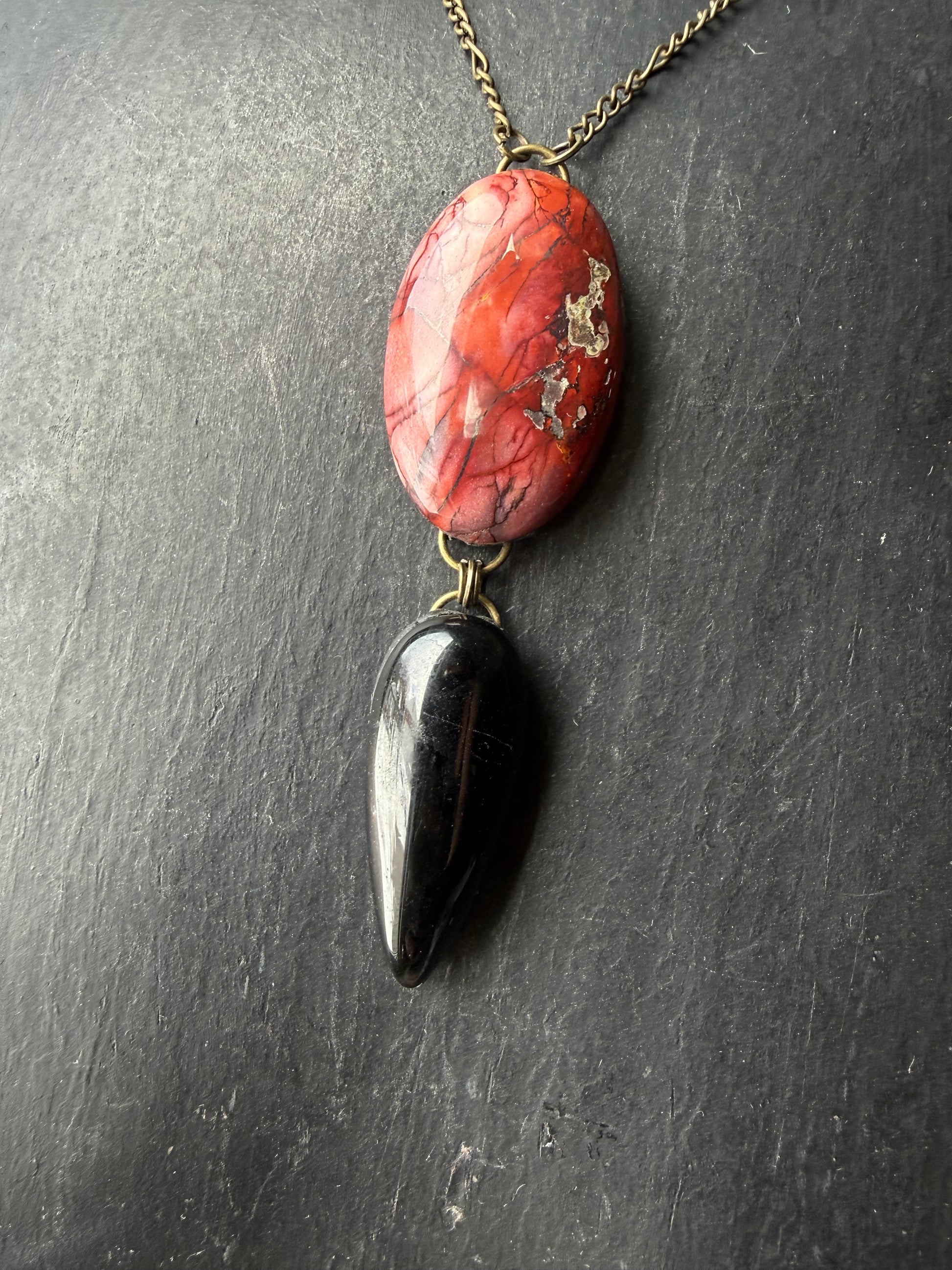 Red Mookaite Jasper and Black obsidian in hand sculpted setting strung on brass chain 16 inches long . Grounding and protection