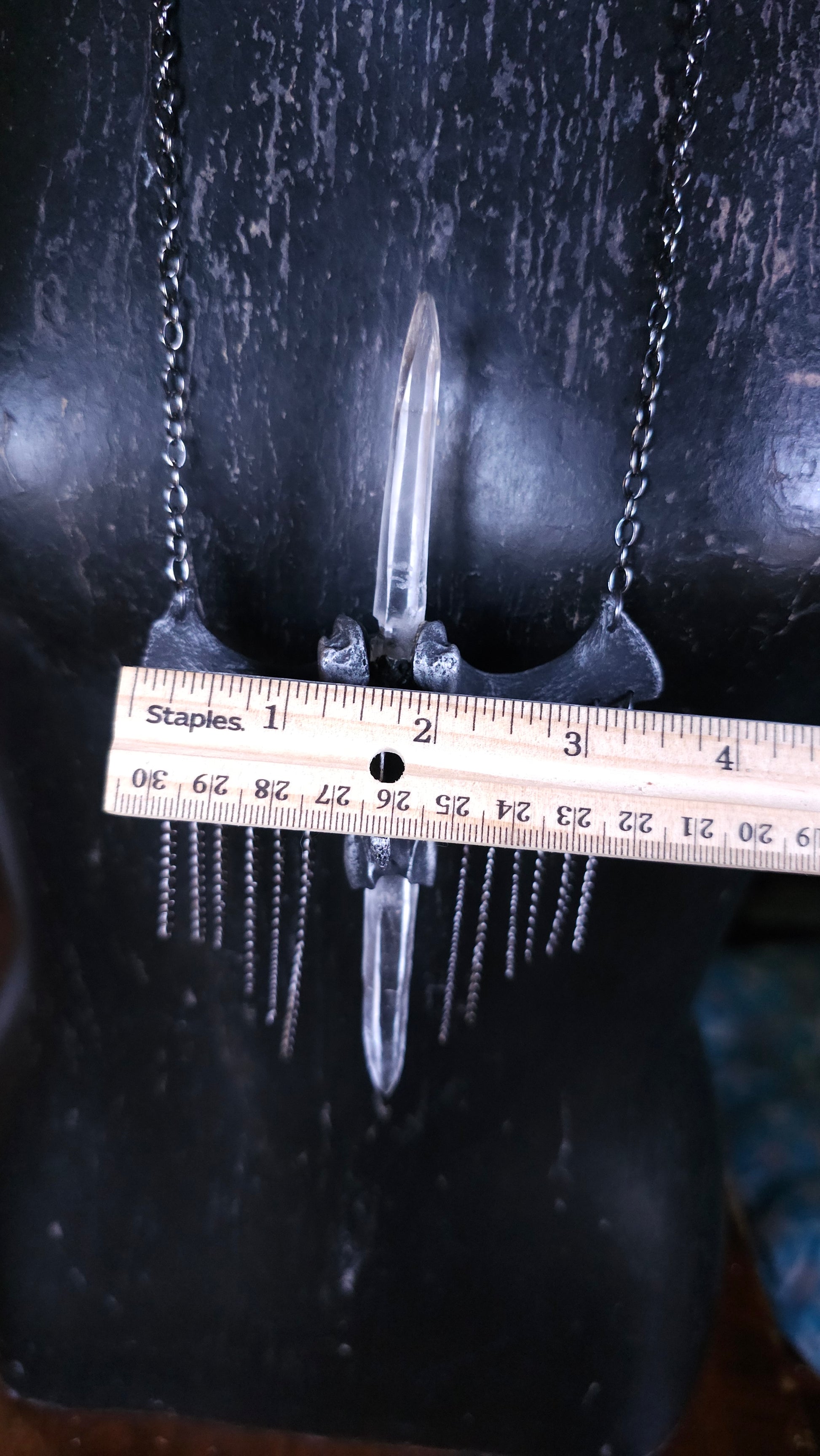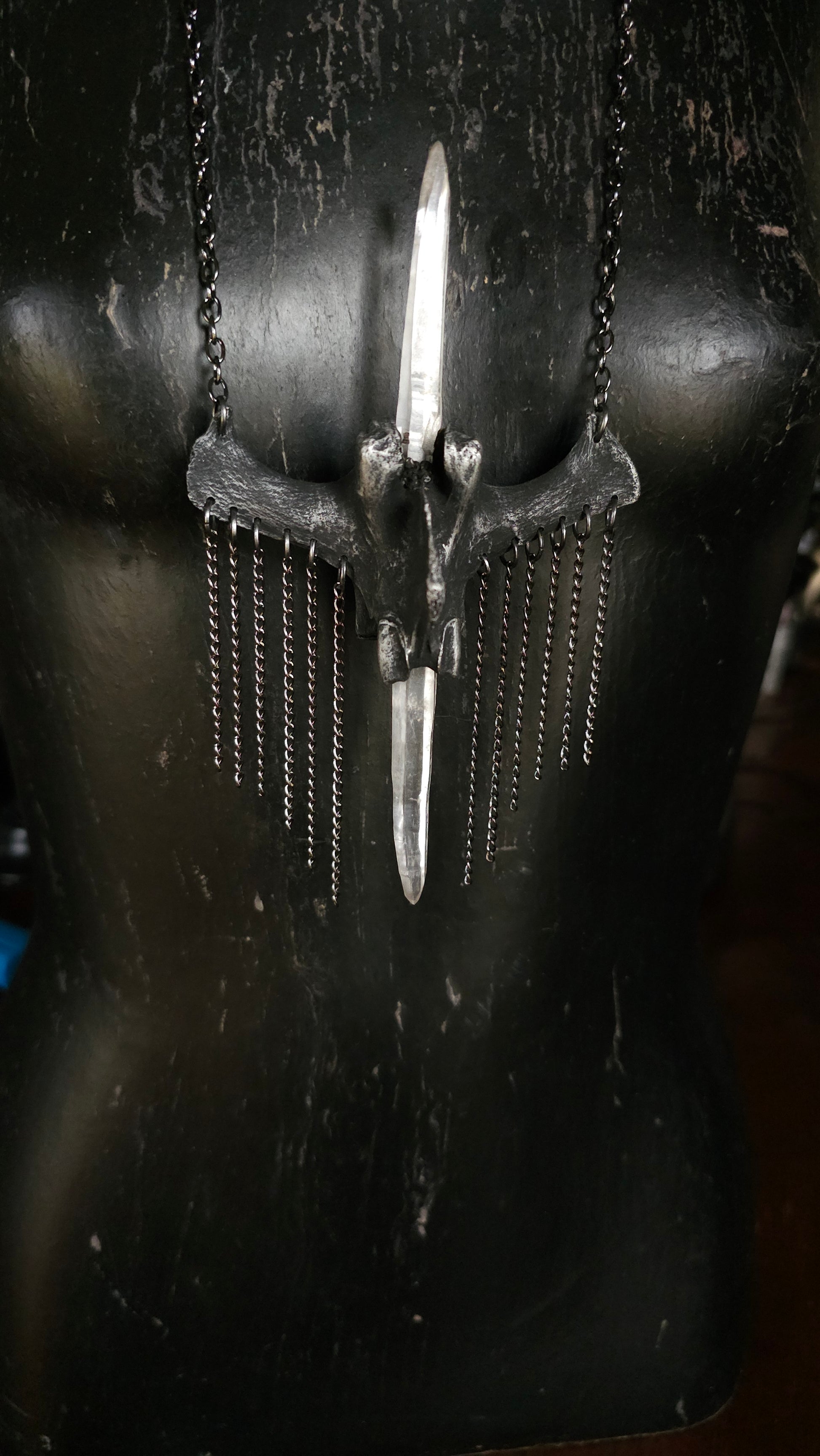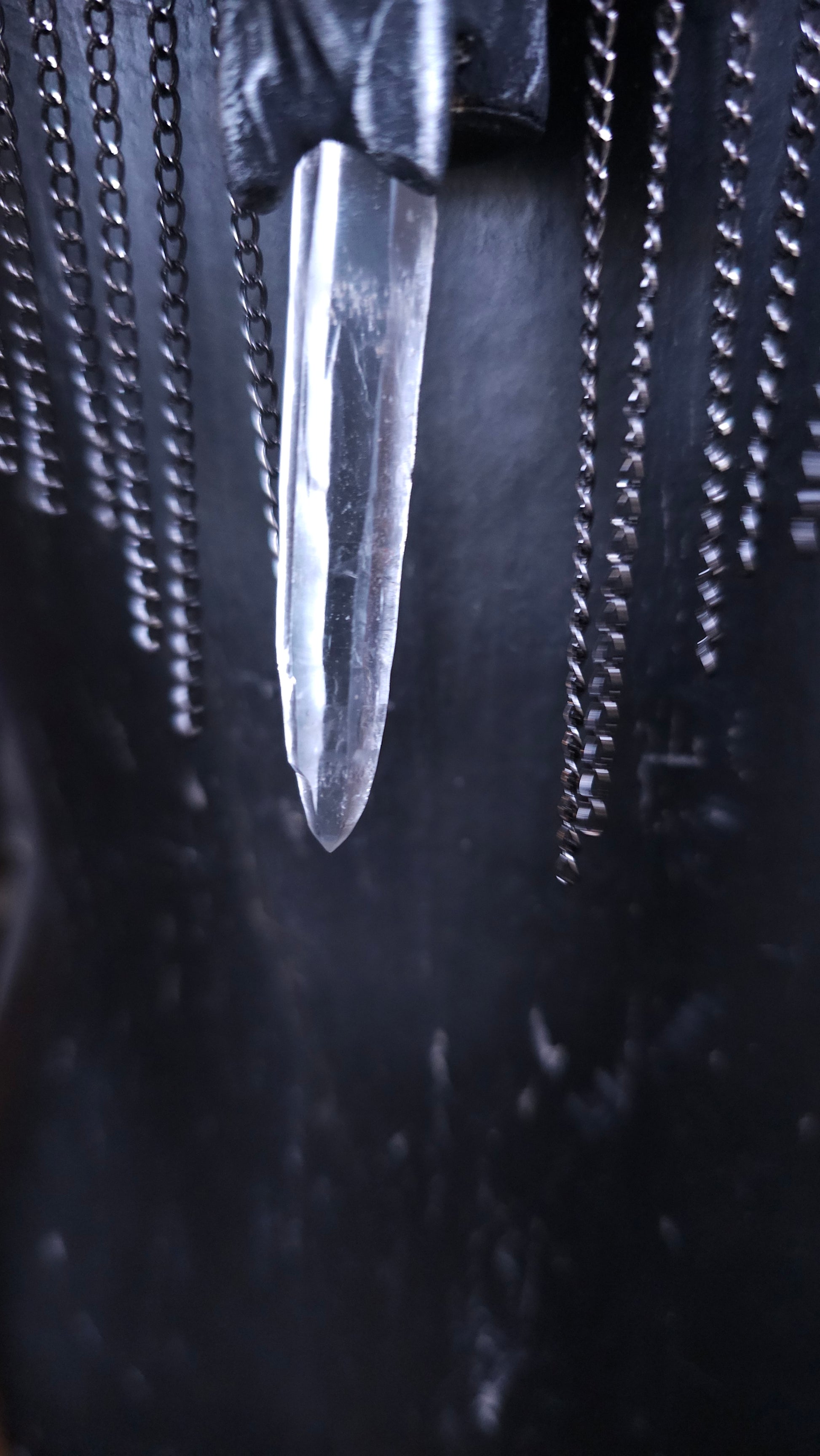 2 Brazilian Laser Quartz in their natural Normand untouched by man . May have natural "blemishes " but they are natural and the way they are supposed to be. They are encased by a naturally found cow vertebrae and have a gradient gunmetal chain strung on a gunmetal chain approximately 24 inches long.