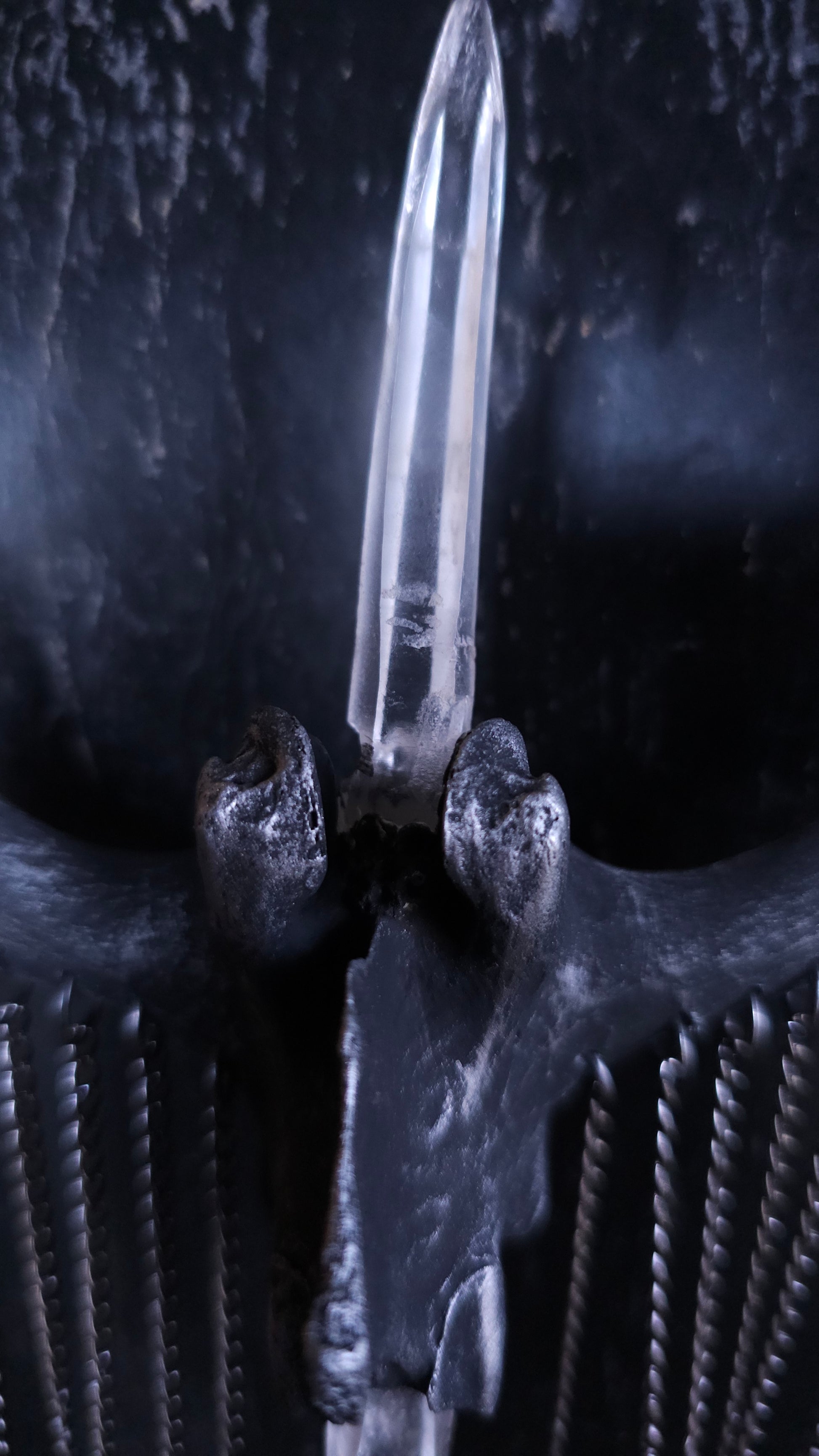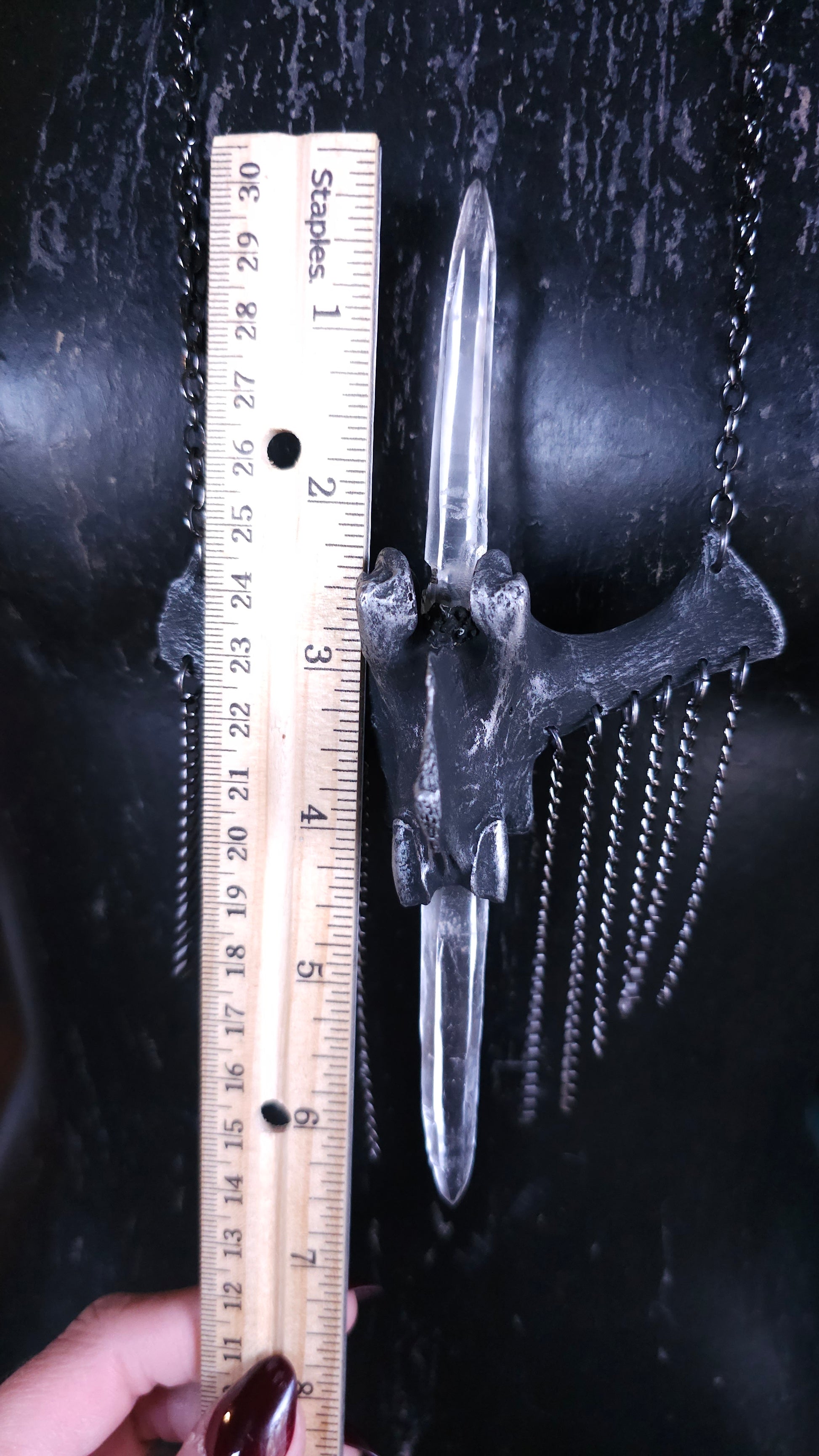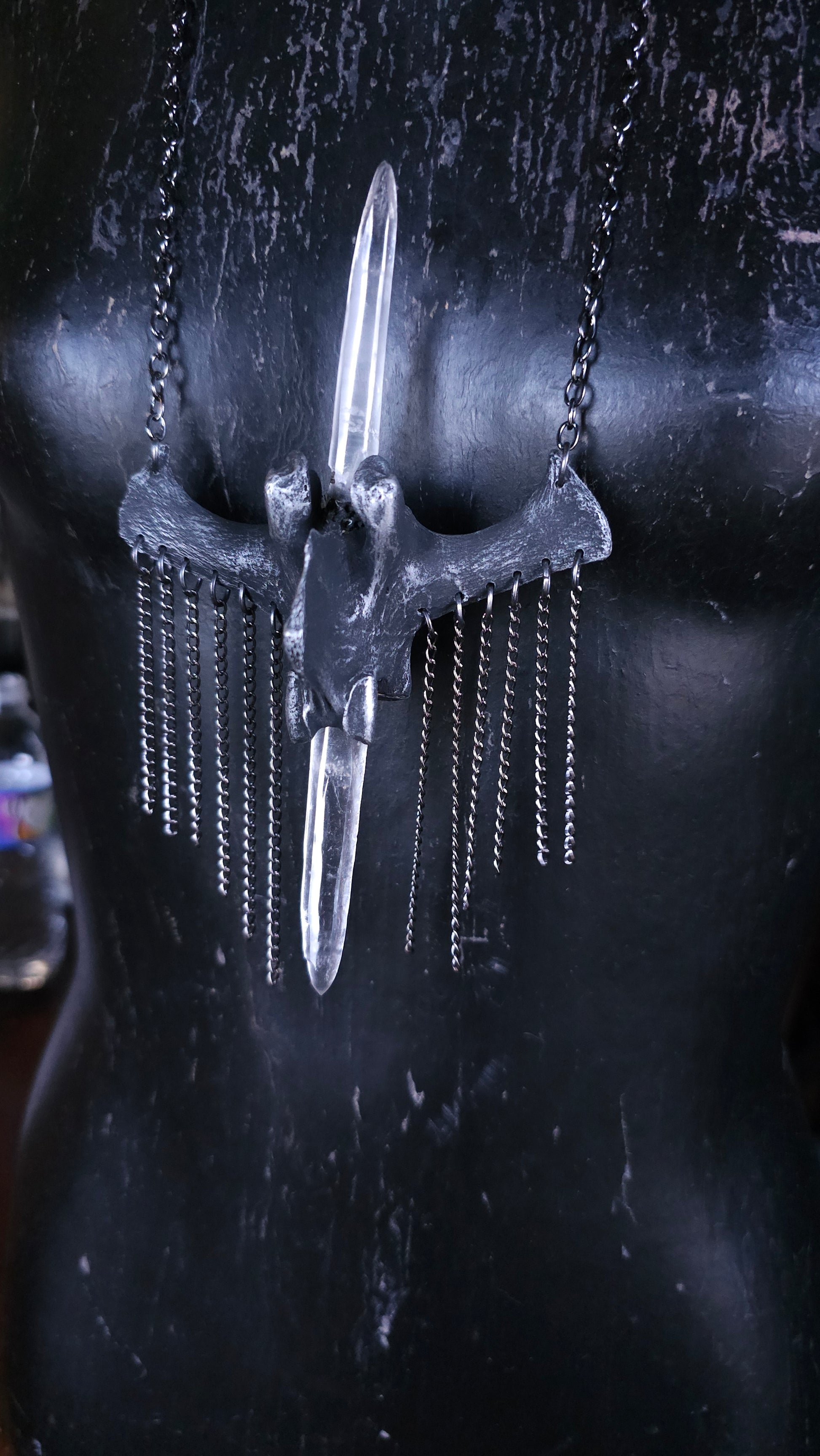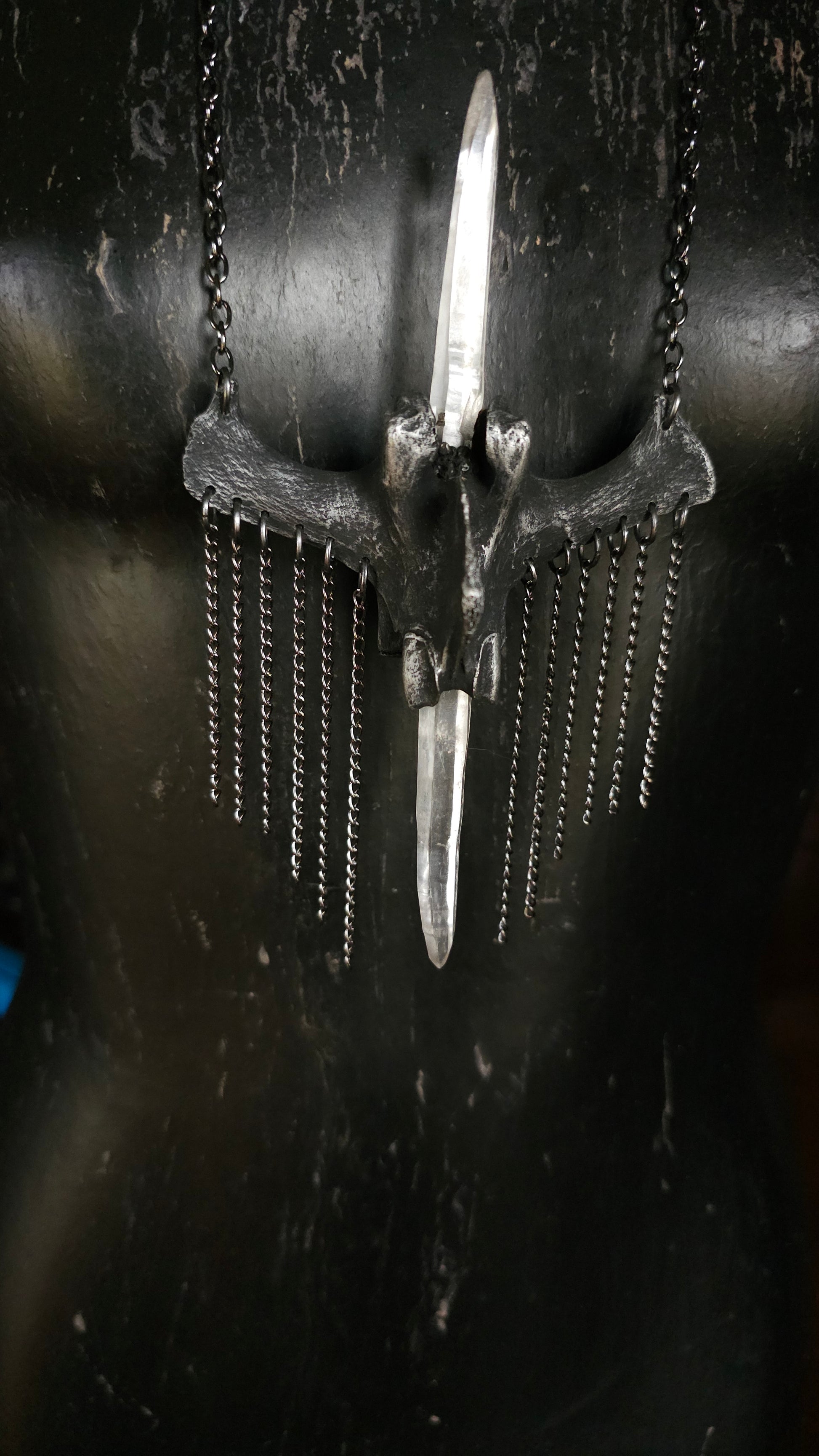 2 Brazilian Laser Quartz in their natural Normand untouched by man . May have natural "blemishes " but they are natural and the way they are supposed to be. They are encased by a naturally found cow vertebrae and have a gradient gunmetal chain strung on a gunmetal chain approximately 24 inches long.
